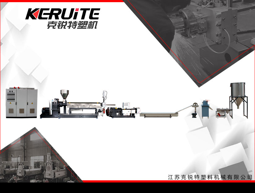 流程:開機預熱->自動上料喂料->主機塑化->副機塑化擠出->水槽冷卻牽條->吹風機吹干->切粒機牽引切粒->吹料存儲->放料裝袋。